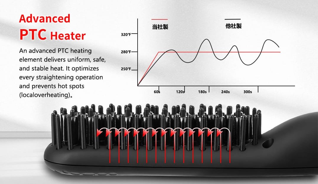 The advanced PTC heating component delivers even, safe and consistentheat to optimize straightening with every pass and avoid any “hot spots”.